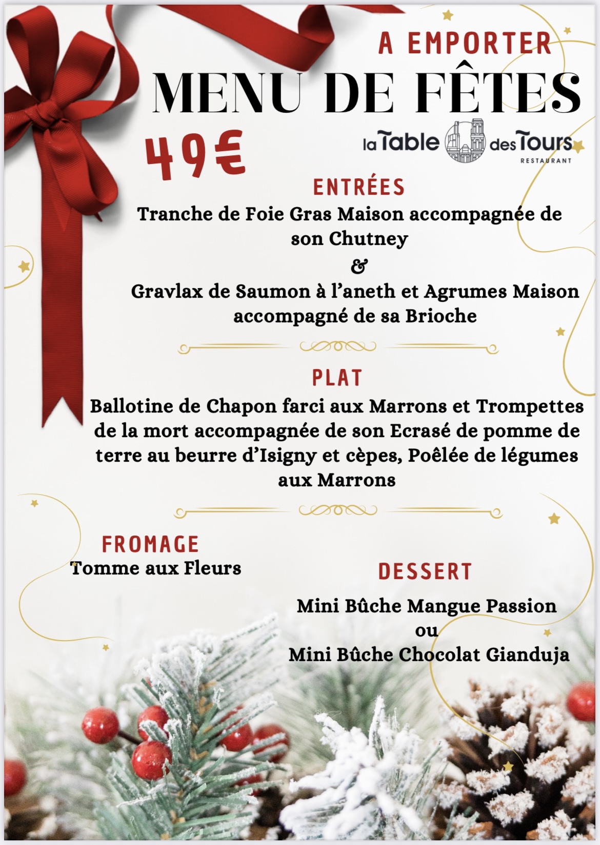 Le menu de fin d’année 2025 à emporter de La Table des Tours : des plats festifs, raffinés et préparés avec soin par notre chef Vincent CONTANT. Régalez-vous avec des mets traditionnels revisités, idéals pour sublimer vos repas de fêtes en toute simplicité. Commandez dès maintenant et savourez un menu gourmand, sans les contraintes de la cuisine.